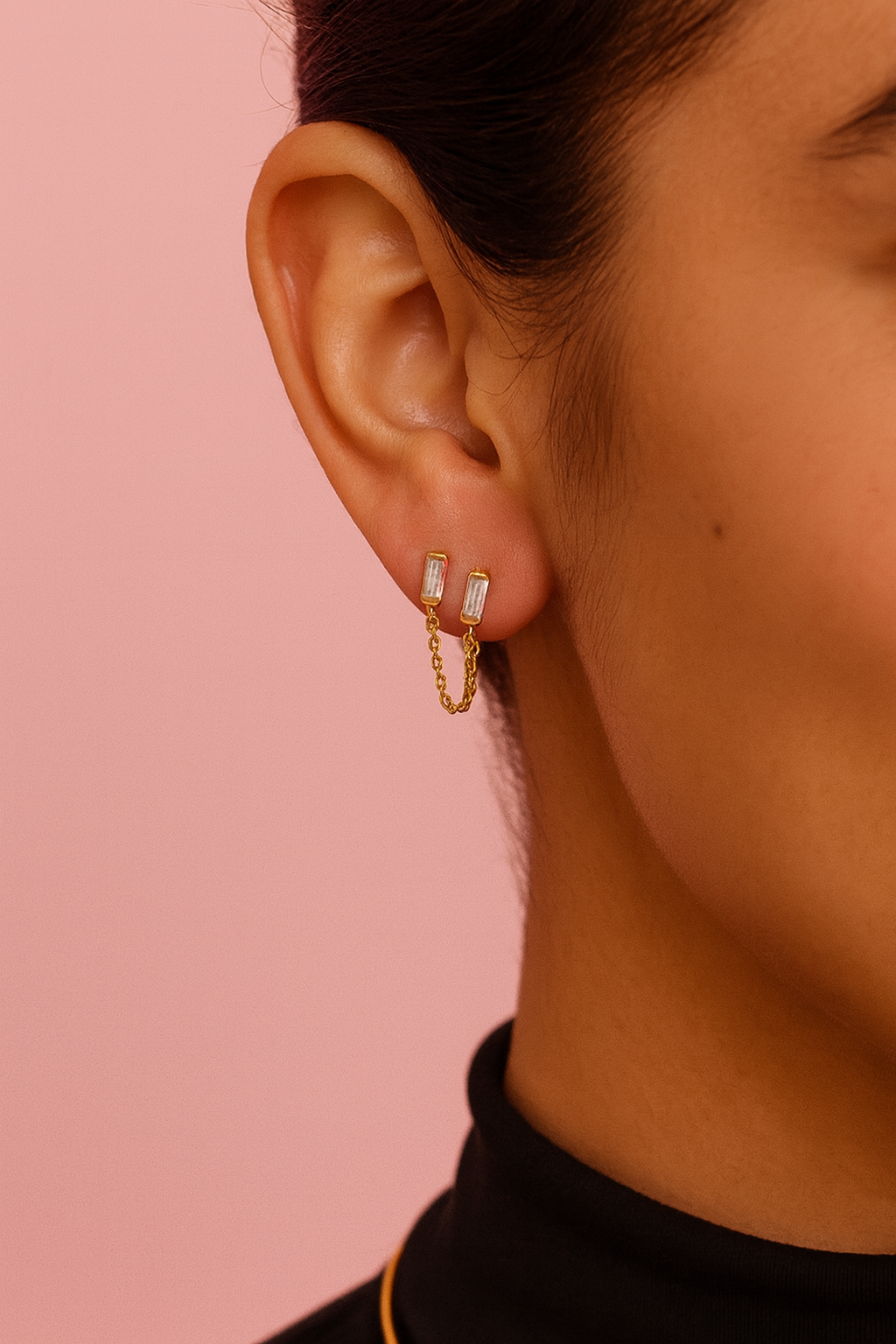 The Baguette Chain Drops feature two petite baguette-cut stones linked by a fine gold chain, creating a soft drape that catches the light with every turn. Minimal, feminine, and effortlessly elevated — these earrings add a refined sparkle to your everyday style.