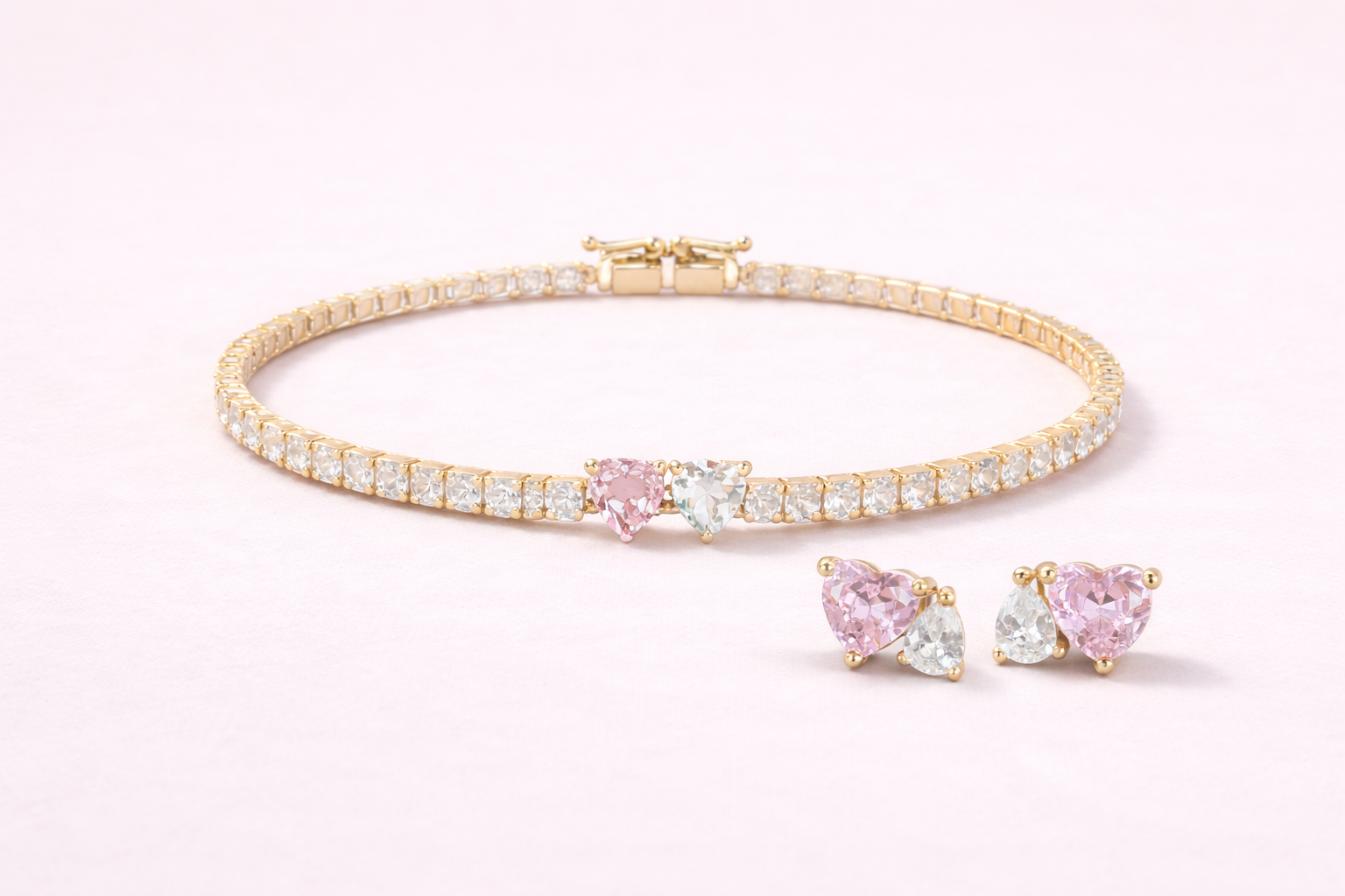 A romantic pairing designed to shine together. The Twin Heart Matching Set features delicate cubic zirconia stones with soft pink and clear heart accents, blending timeless elegance with a touch of femininity.