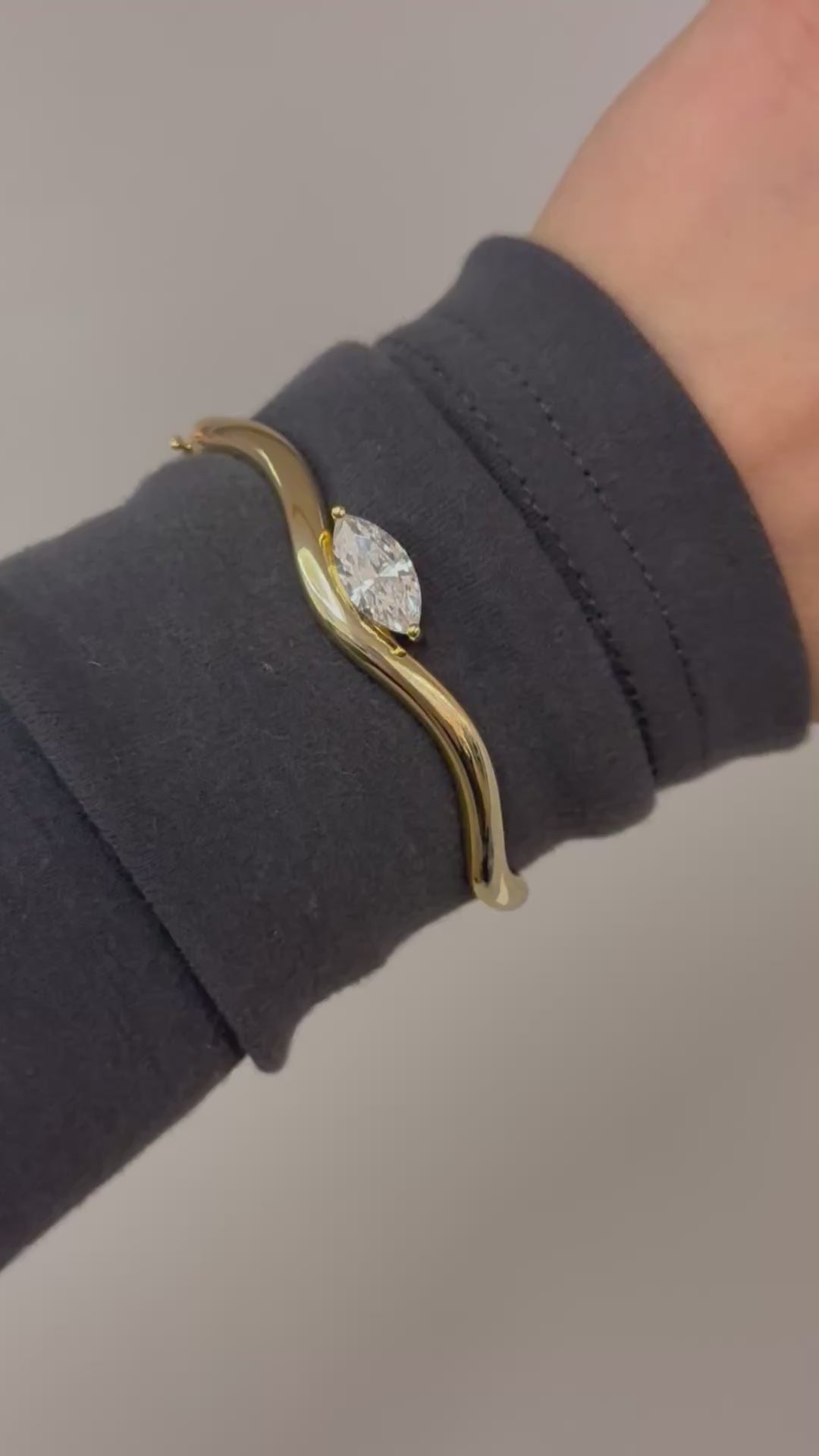 A sculptural gold cuff designed with a soft wave silhouette and finished with a marquise-cut stone at the center. Fluid yet structured, this piece catches the light effortlessly and elevates everyday wear.