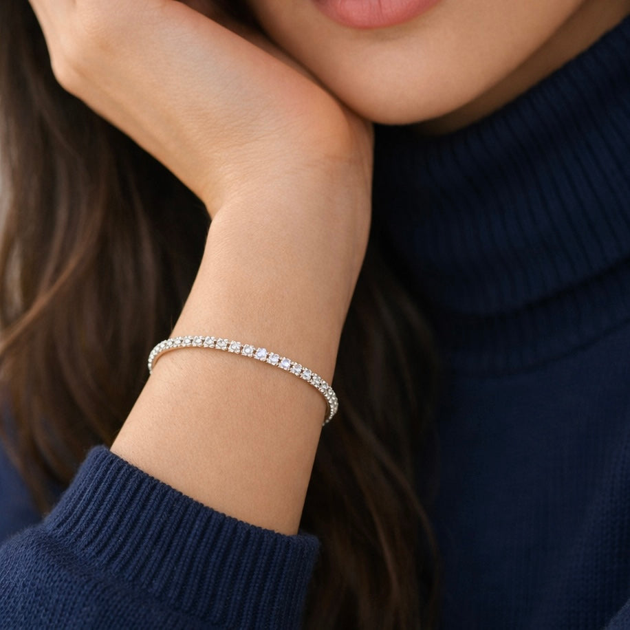 This timeless 2mm tennis bracelet offers a soft, luminous sparkle that feels both elevated and effortless. Minimal yet intentional, it adds a touch of femininity to everyday moments while remaining timeless enough for special occasions.
